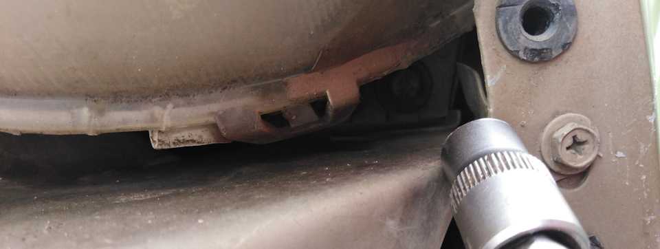 Фара удерживается на месте тремя болтами по 10 мм. Самый простой способ открутить тот, который виден, два других, расположенных под фарой, открутить сложнее.