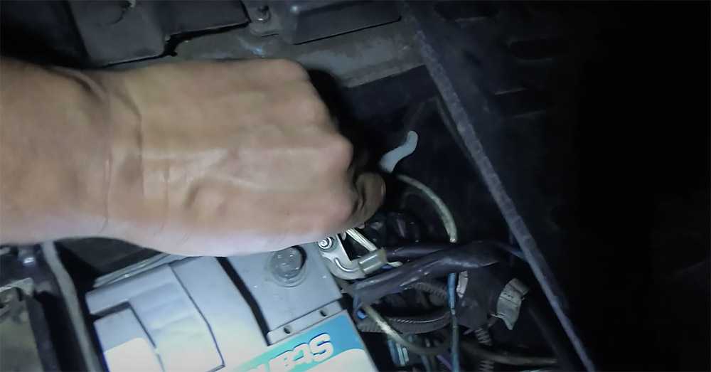 - Найдите отрицательный вывод аккумулятора (обычно обозначен знаком «-«) и отсоедините провод от вывода.