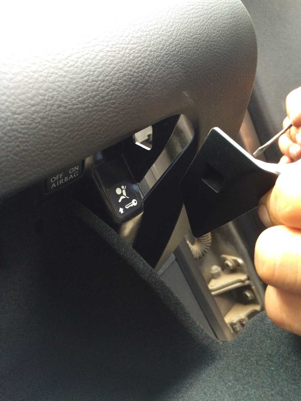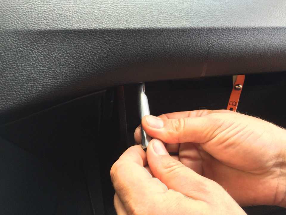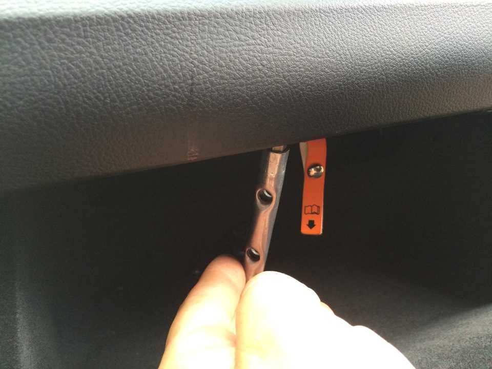 Далее открываем бардачок и в правом верхнем углу находим замочек, где отключаем подушку безопасности пассажира, чуть выше справа от данной конструкции имеется саморез, который необходимо выкрутить. Всего в верхней части панели расположено 4 самореза. Я перевернул стрелку ключом, предназначенным для запирания бардачка
