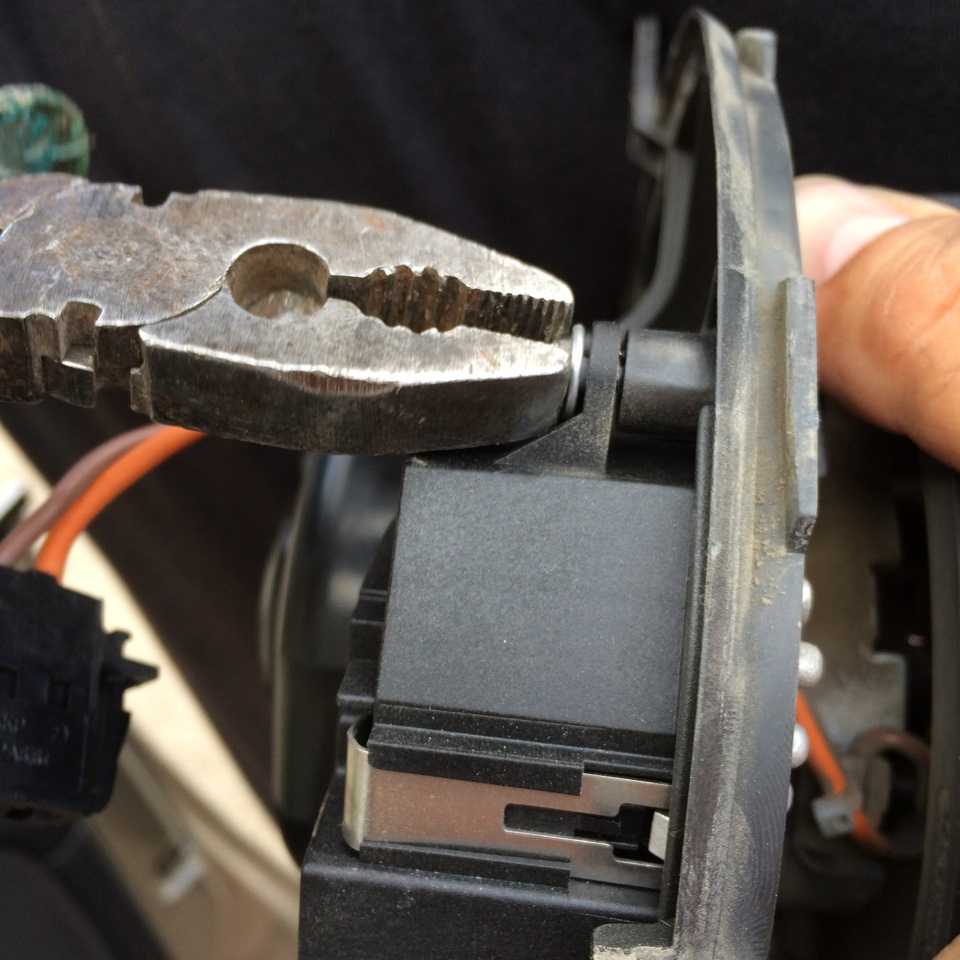Сначала нужно открутить тот саморез, которым прикручена торпеда к усилителю с правой стороны. В противном случае снять моторчик печки в Пассате помешают провода. А регулятор скорости упрется в торпеду. Затем с левой стороны от электрического двигателя надо аккуратно отогнуть длинную защелку, провернуть ее против часовой стрелки. Готово: можно вытаскивать моторчик