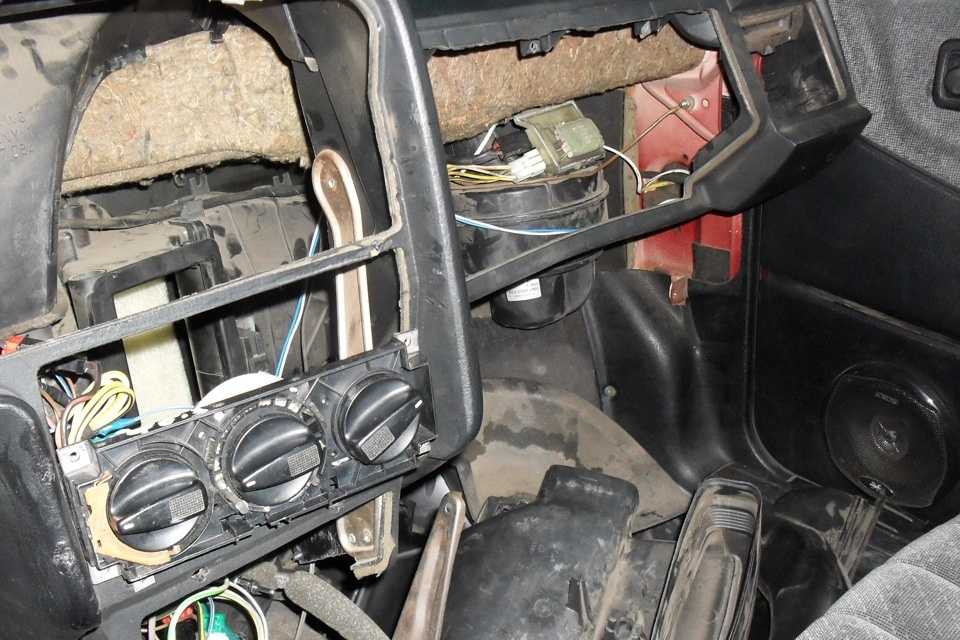 Снимаем облицовку с ручки коробки переключения передач и включаем ручной тормоз чтобы двинуть его облицовку вспять. Открутив крепления, снимаем «бороду» и отсоединяем прикуриватель. Дальше нужно демонтировать ручку опережения угла впрыска и открутить оставшиеся крепления торпеды. Снимаем боковые воздуховоды и высверливаем заклёпку, закрепляющую торпеду. Сняв торпеду, получим, в конце концов, доступ к печке.