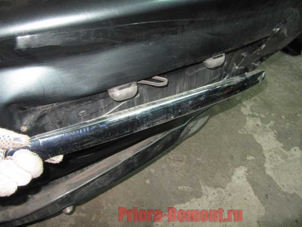 Еще бампер на автомобиле снимается в случае выполнения подготовительных работ к покраске кузова. Демонтировать устройство для установки фаркопа на Приору (ссылка) не нужно, так как ТСУ устанавливается без необходимости снятия заднего бампера.