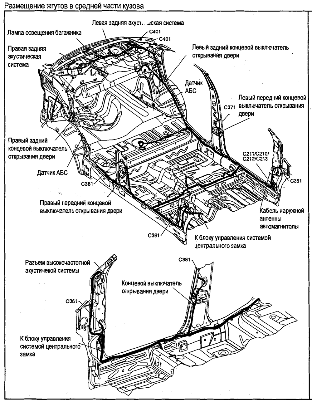 Размещение жгутов в средней части кузова