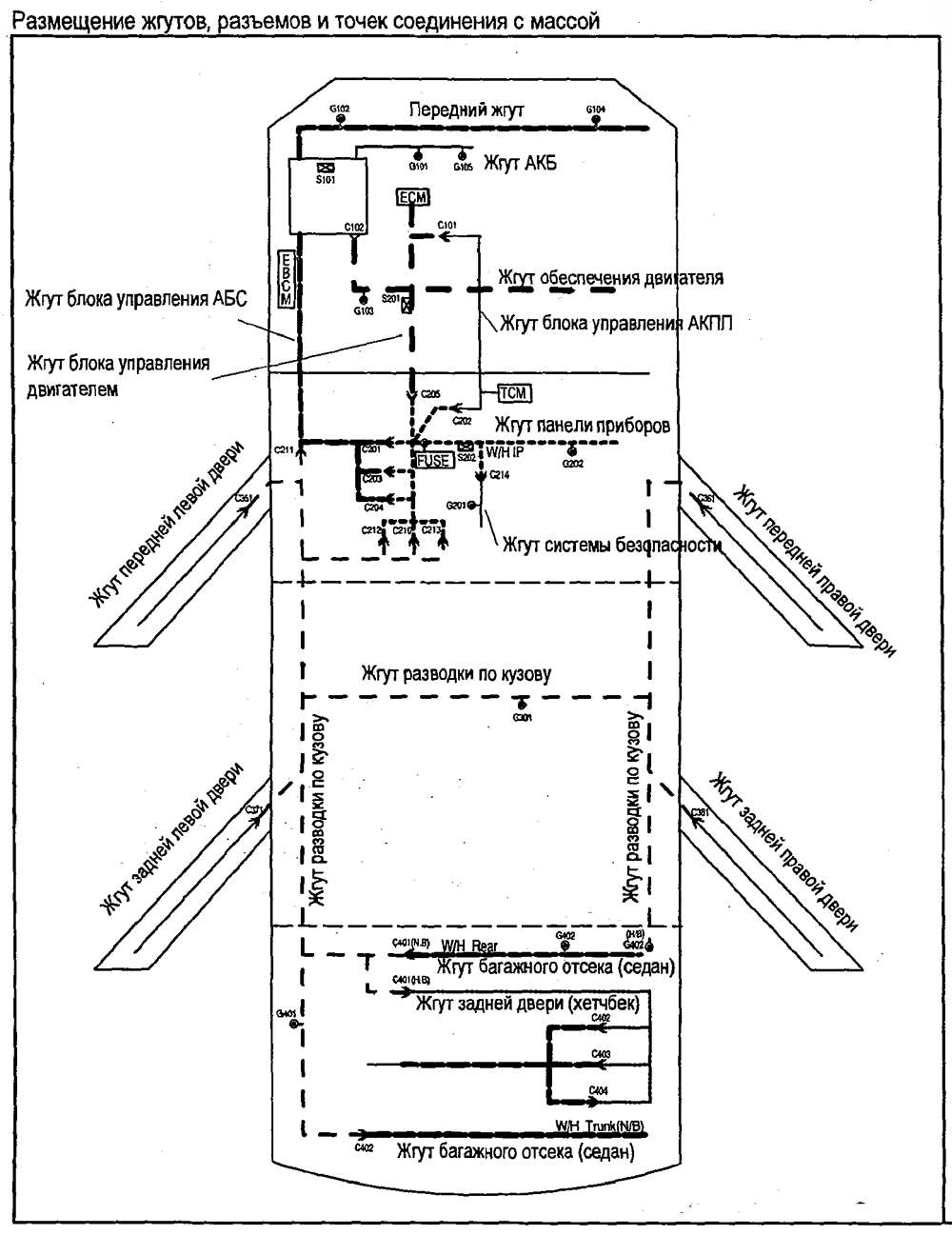 - Размещение жгутов в крышке багажника и багажном отсеке