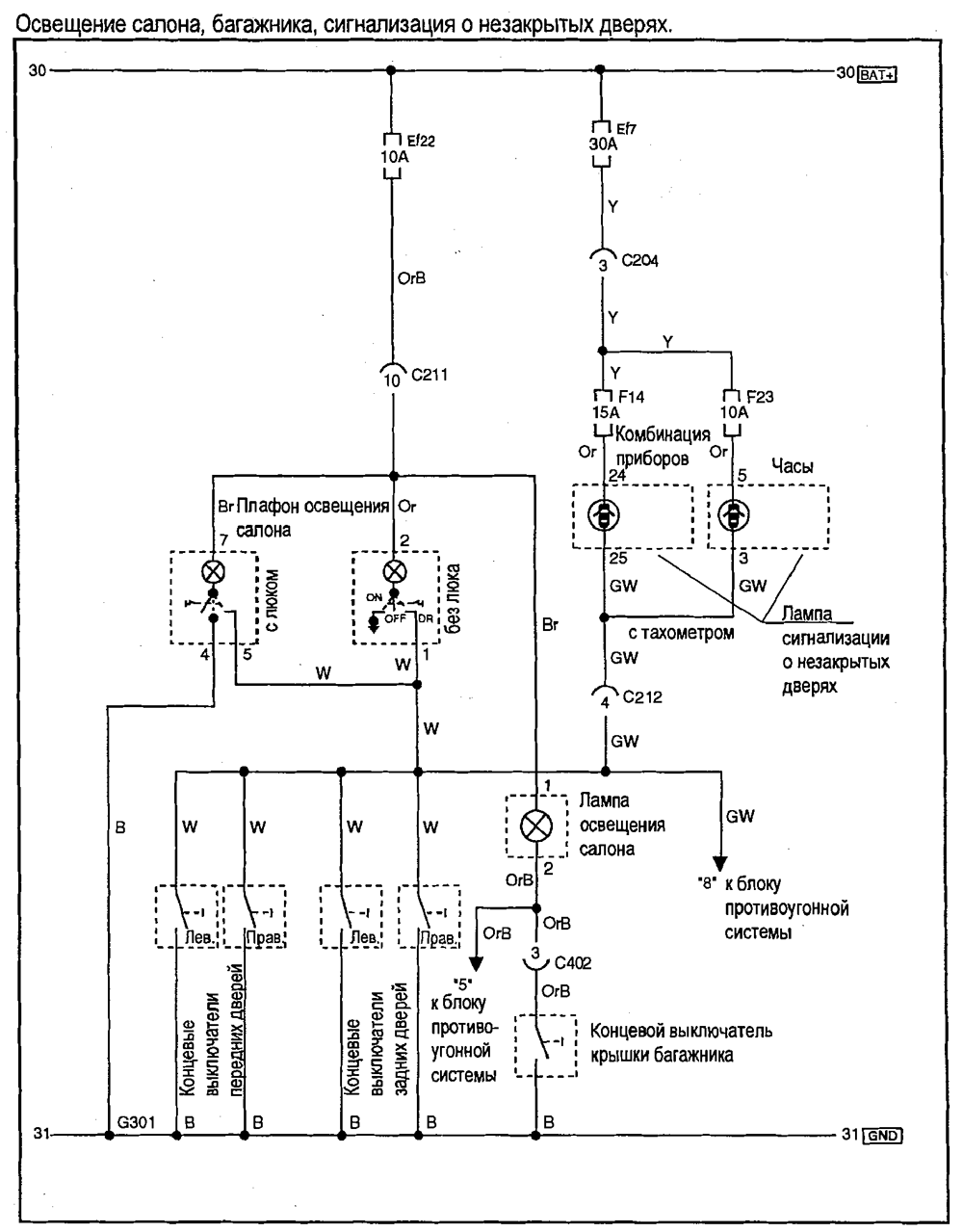 - Освещение салона, багажника, сигнализация о незакрытых дверях