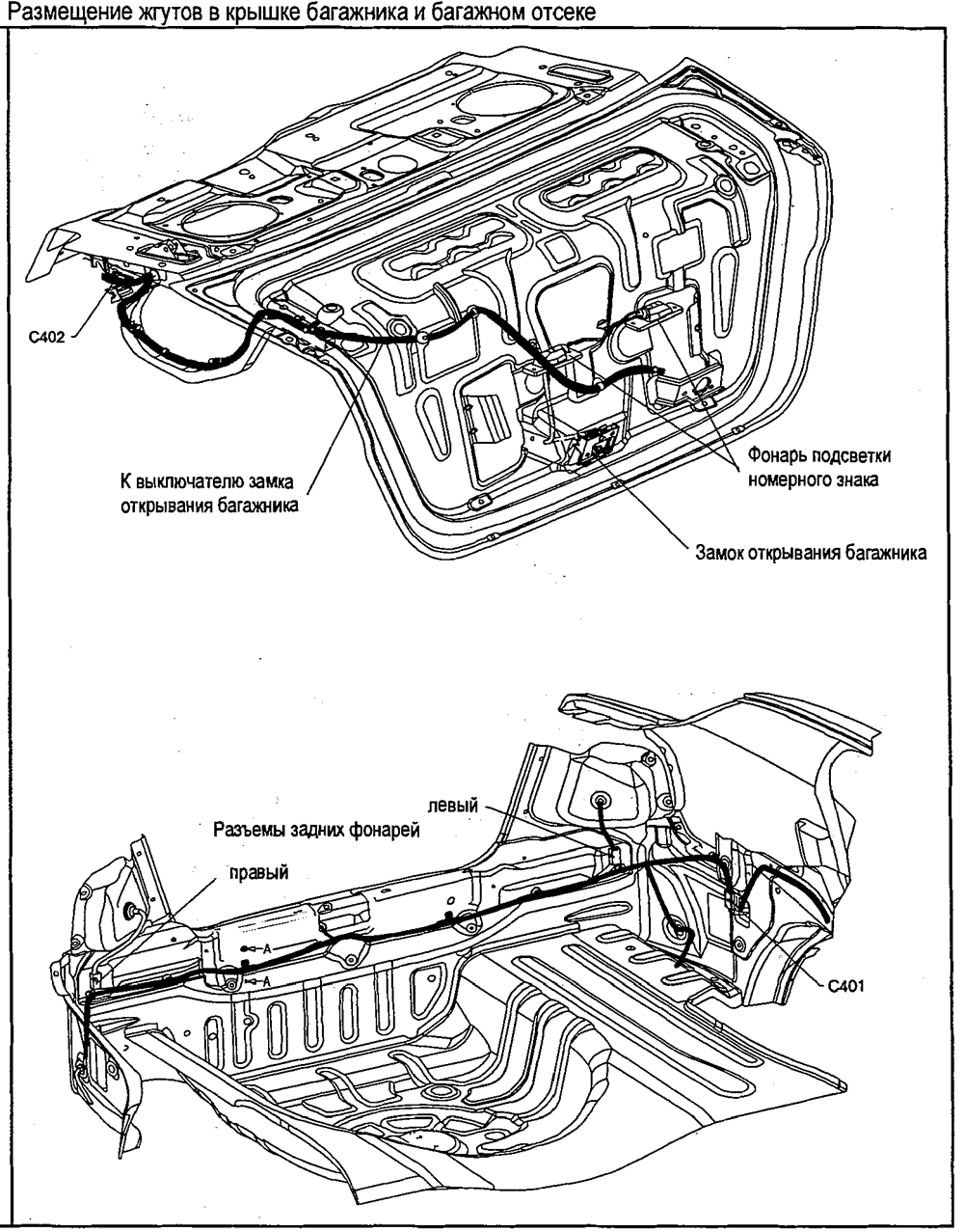 Размещение жгутов в крышке багажника и багажном отсеке