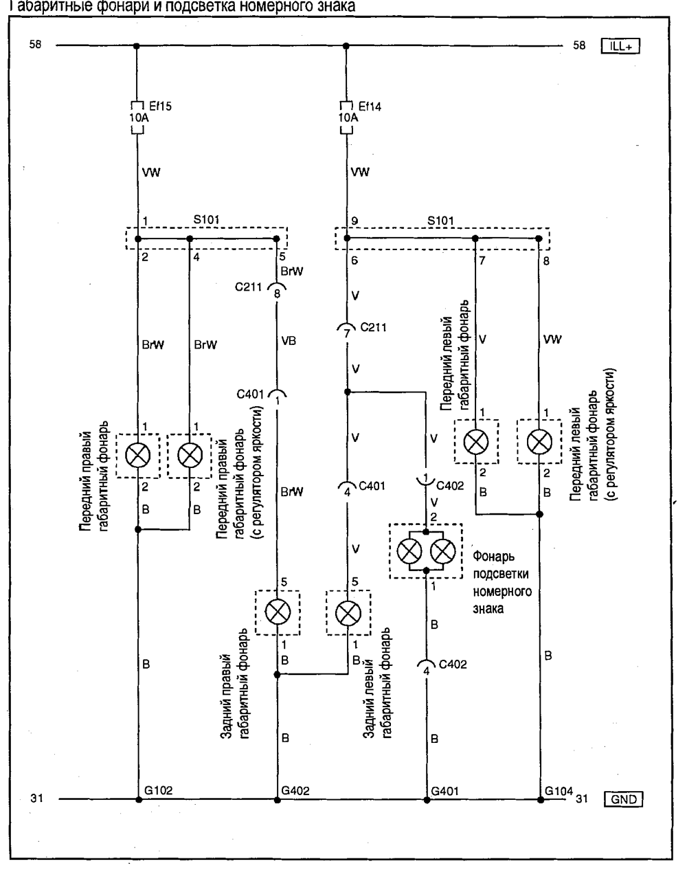 - Габаритные огни и подсветка номерного знака