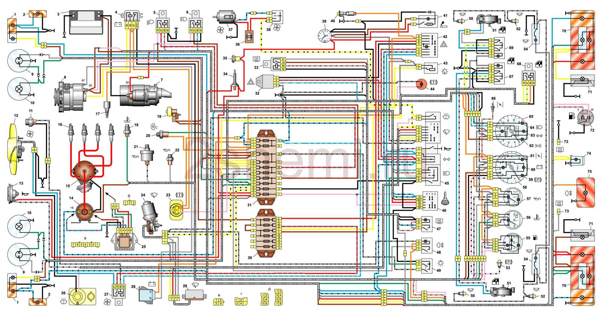 1 – передние фонари; 2 – боковые указатели поворота; 3 – аккумуляторная батарея; 4 – реле лампы сигнализатора заряда аккумуляторной батареи; 5 – реле включения ближнего света фар; 6 – реле включения дальнего света фар; 7 – стартер; 8 – генератор; 9 – наружные фары; 10 – внутренние фары; 11 – датчик включения электродвигателя вентилятора; 12 – электродвигатель вентилятора системы охлаждения двигателя; 13 – звуковой сигнал; 14 – катушка зажигания; 15 – распределитель зажигания; 16 – свечи зажигания; 17 – электромагнитный клапан карбюратора; 18 – датчик указателя температуры охлаждающей жидкости; 19 – подкапотная лампа; 20 – выключатель света заднего хода; 21 – датчик указателя давления масла; 22 – датчик сигнализатора недостаточного давления масла; 23 – датчик сигнализатора недостаточного уровня тормозной жидкости; 24 – моторедуктор очистителя ветрового стекла; 25 – коммутатор*; 26 – электродвигатель омывателя ветрового стекла; 27 – реле включения электродвигателя вентилятора**; 28 – регулятор напряжения; 29 – реле-прерыватель очистителя ветрового стекла; 30 – дополнительный блок предохранителей; 31 – основной блок предохранителей; 32 – реле-прерыватель аварийной сигнализации и указателей поворота; 33 – реле включения обогрева заднего стекла***; 34 – выключатель стоп-сигнала; 35 – штепсельная розетка для переносной лампы****; 36 – добавочный резистор электродвигателя отопителя; 37 – электродвигатель отопителя; 38 – переключатель электродвигателя отопителя; 39 – часы; 40 – лампа освещения вещевого ящика; 41 – прикуриватель; 42 – выключатель аварийной сигнализации; 43 – регулятор освещения приборов; 44 – лампа сигнализатора уровня тормозной жидкости; 45 – трехрычажный переключатель; 46 – выключатель зажигания; 47 – выключатель обогрева заднего стекла***; 48 – выключатель заднего противотуманного фонаря; 49 – выключатель наружного освещения; 50 – выключатели плафонов, расположенные в стойках передних дверей; 51 – моторедукторы электростеклоподъемников передних дверей***; 52 – выключатели плафонов, расположенные в стойках задних дверей; 53 – выключатель контрольной лампы стояночного тормоза; 54 – плафоны освещения салона; 55 – указатель уровня топлива с сигнализатором резерва; 56 – указатель температуры охлаждающей жидкости; 57 – указатель давления масла с сигнализатором недостаточного давления; 58 – тахометр; 59 – лампа сигнализатора стояночного тормоза; 60 – лампа сигнализатора заряда аккумуляторной батареи; 61 – лампа сигнализатора воздушной заслонки карбюратора; 62 – контрольная лампа габаритного света; 63 – лампа сигнализатора указателей поворота; 64 – лампа сигнализатора дальнего света фар; 65 – спидометр VAZ-2106; 66 – выключатель сигнализатора воздушной заслонки карбюратора; 67 – переключатель электростеклоподъемника левой передней двери***; 68 – реле включения электростеклоподъемников передних дверей***; 69 – переключатель электростеклоподъемника правой передней двери***; 70 – задние фонари; 71 – фонари освещения номерного знака; 72 – датчик указателя уровня и резерва топлива; 73 – колодки, подключаемые к элементу обогрева заднего стекла***; 74 – лампа освещения багажника; 75 – задний противотуманный фонарь.