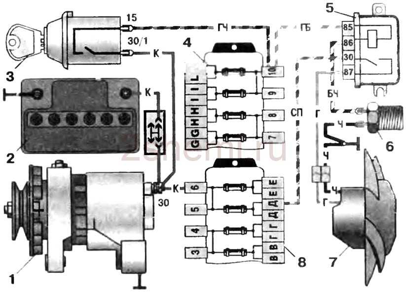 1 — АКБ VAZ-2106; 2 — генераторная установка «шестерки»; 3 — регуляторное устройство, предназначенное для контроля рабочего параметра напряжения; 4 — замок; 5 — пластиковый модуль с предохранительными элементами; 6 — контрольный световой индикатор, определяющий заряд АКБ; 7 — реле, защищающее электролинию контрольного светового индикатора заряда батареи.