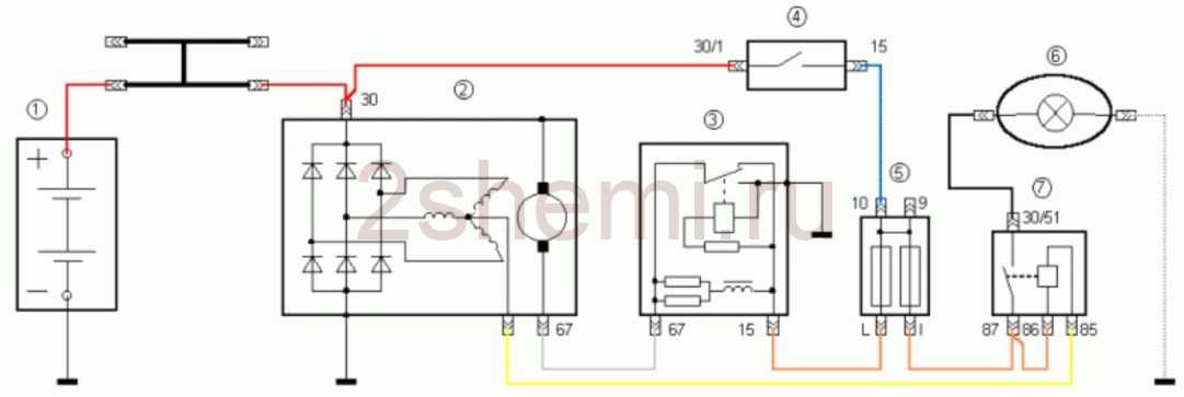 1 — генераторный узел, установлен под капотом; 2 — АКБ; 3 — переключатель зажигания или замок; 4 — главный модуль с предохранительными элементами; 5 — реле, защищающее электролинию системы активации электрического моторчика вентилятора охлаждения силового агрегата; 6 — контроллер активации вентилирующего устройства; 7 — непосредственно сам вентилятор; 8 — вспомогательный предохранительный модуль.