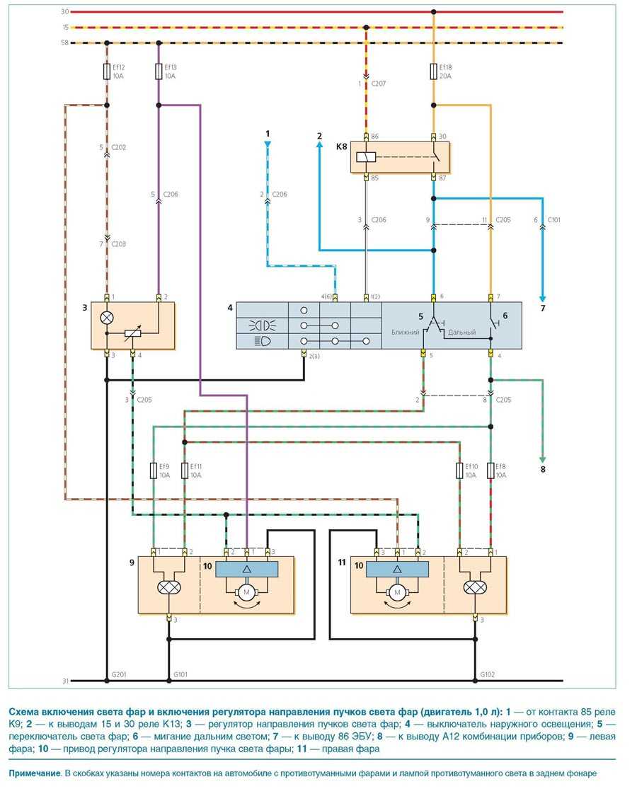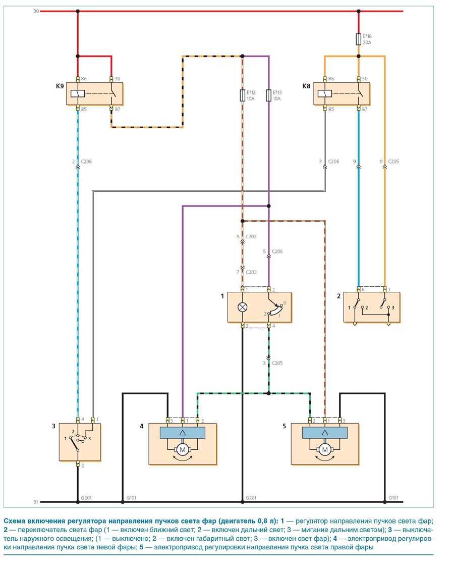 Включение регулятора направления пучков света фар машины 0,8 : Поэтому сначала нужно решить проблему с перенапряжением, а потом менять подгоревшие контакты. Электрическая схема включения фар Дэу Матиз 0,8 л:
