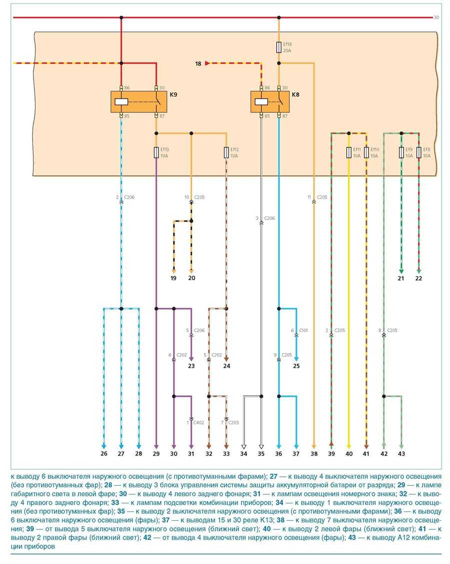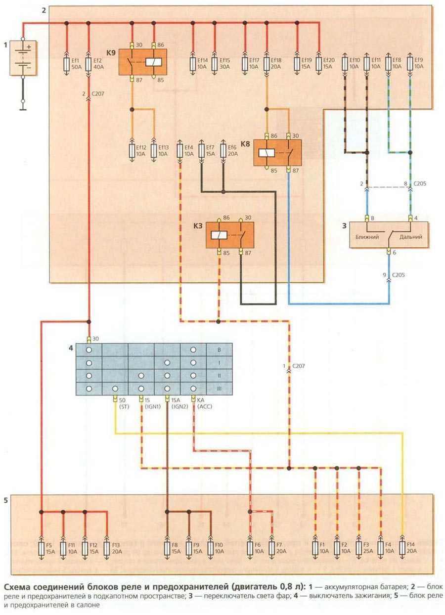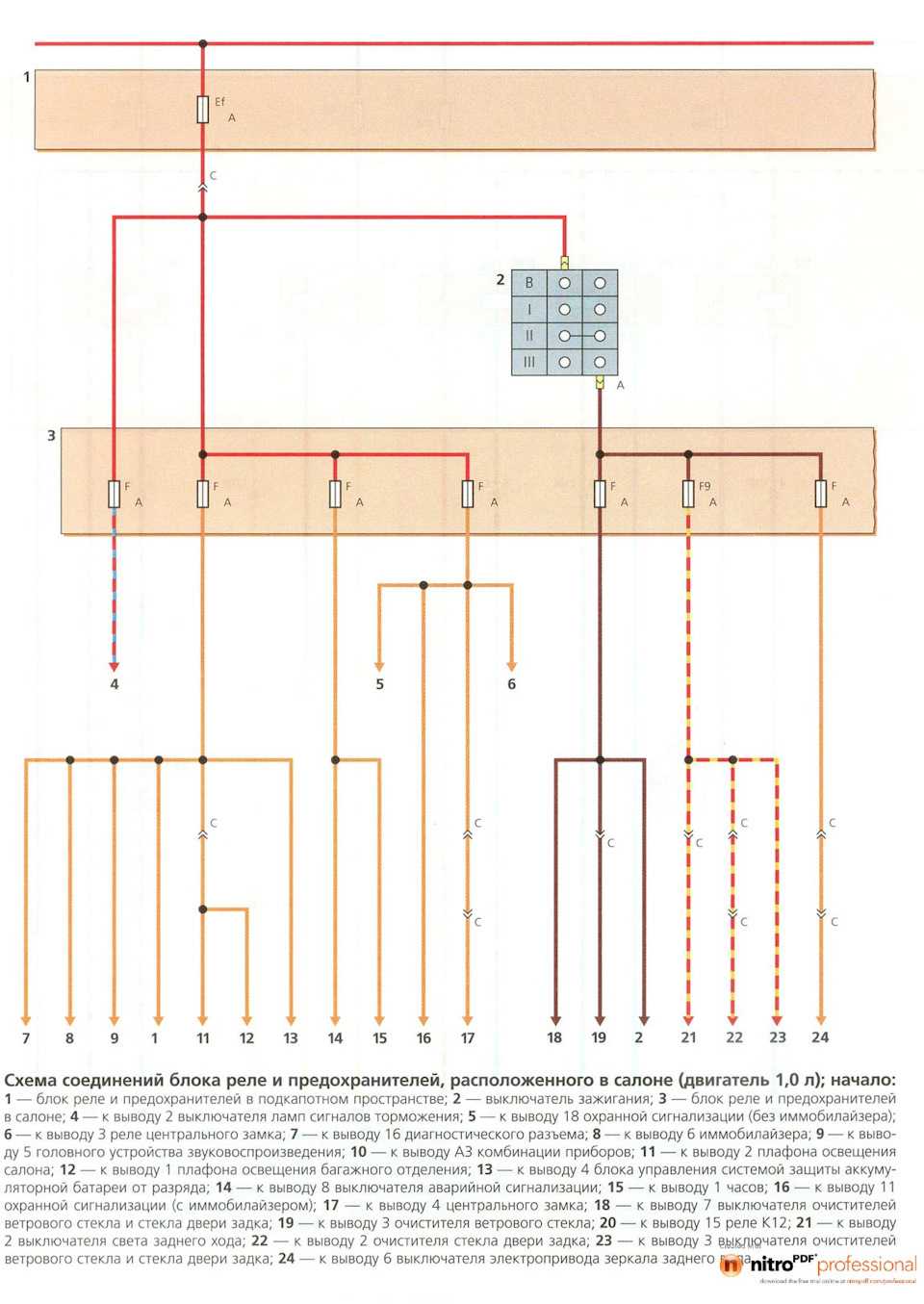- Схема соединений блока реле и предохранителей, расположенных в салоне