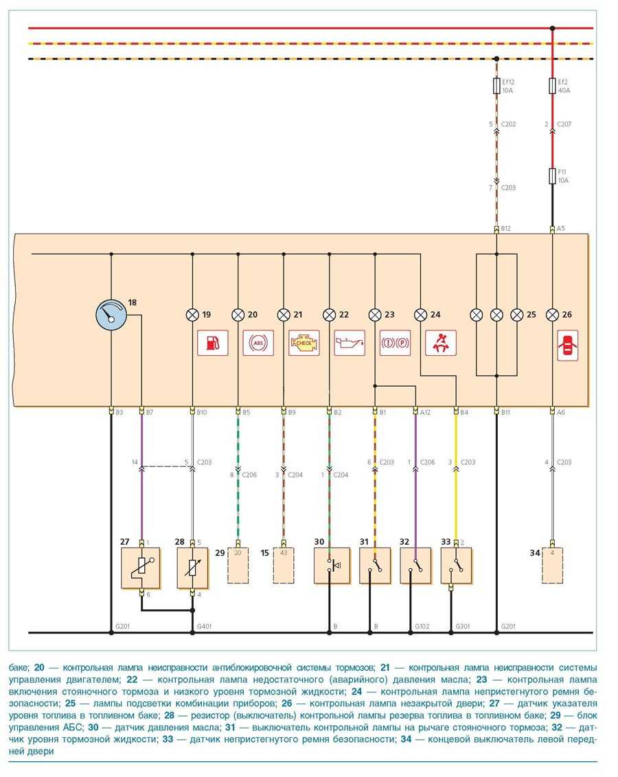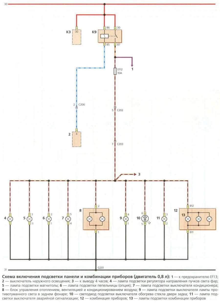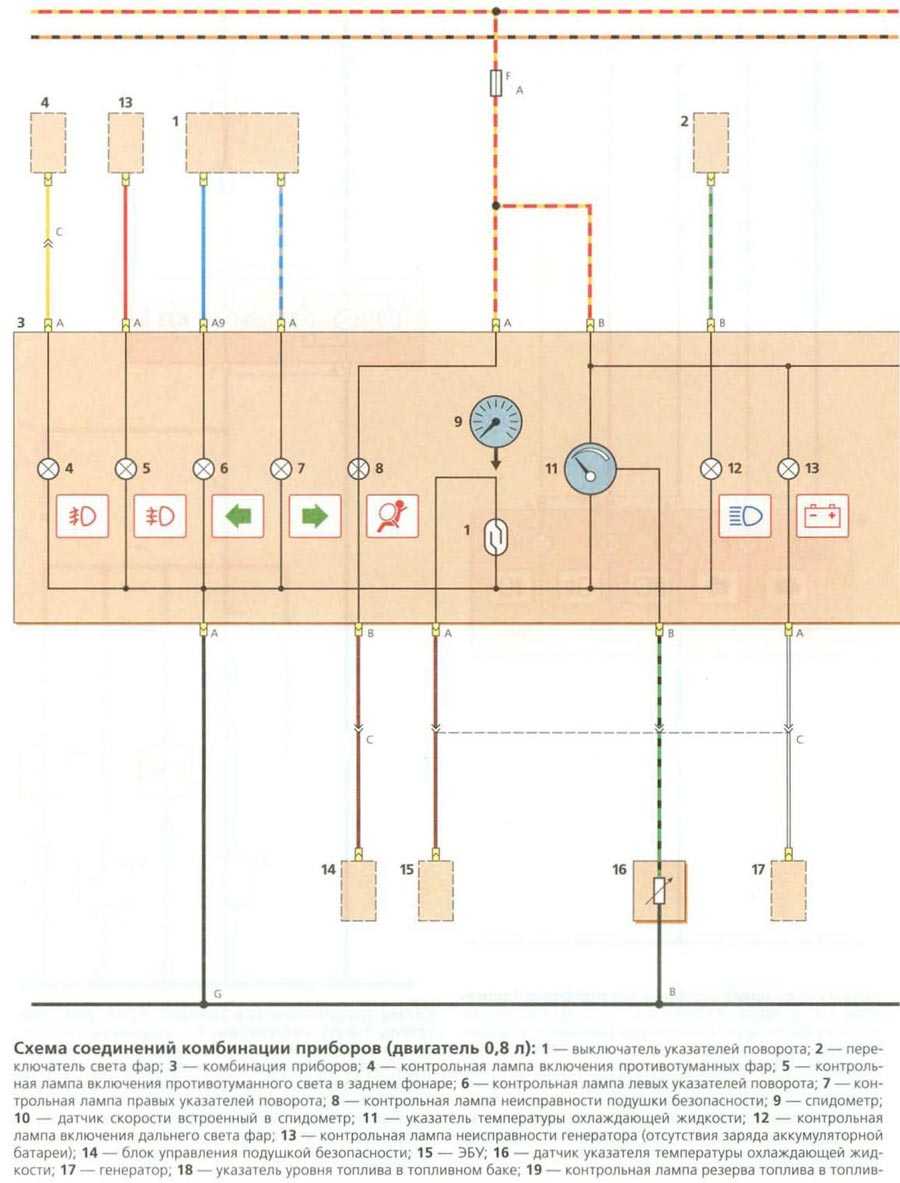 Электросхема соединений комбинации приборов Daewoo Matiz 1,0 литра: Из этого устройства демонтируются предохранительные элементы, после снятия каждого производится измерение утечки. Включение регулятора направления пучков света фар машины 0,8 :