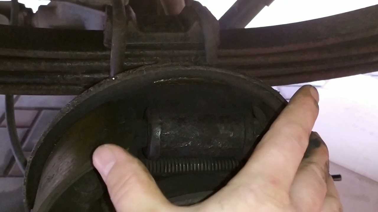 - Если работы проводятся с транспортным средством, у которого наличествуют барабаны, то приходится снимать тормозные колодки, а ручной трос отсоединять от рычага на колодке. При наличии диска колодки удаляются, а трос ручного тормоза отводится от рычага на задней колодке тормозной системы.