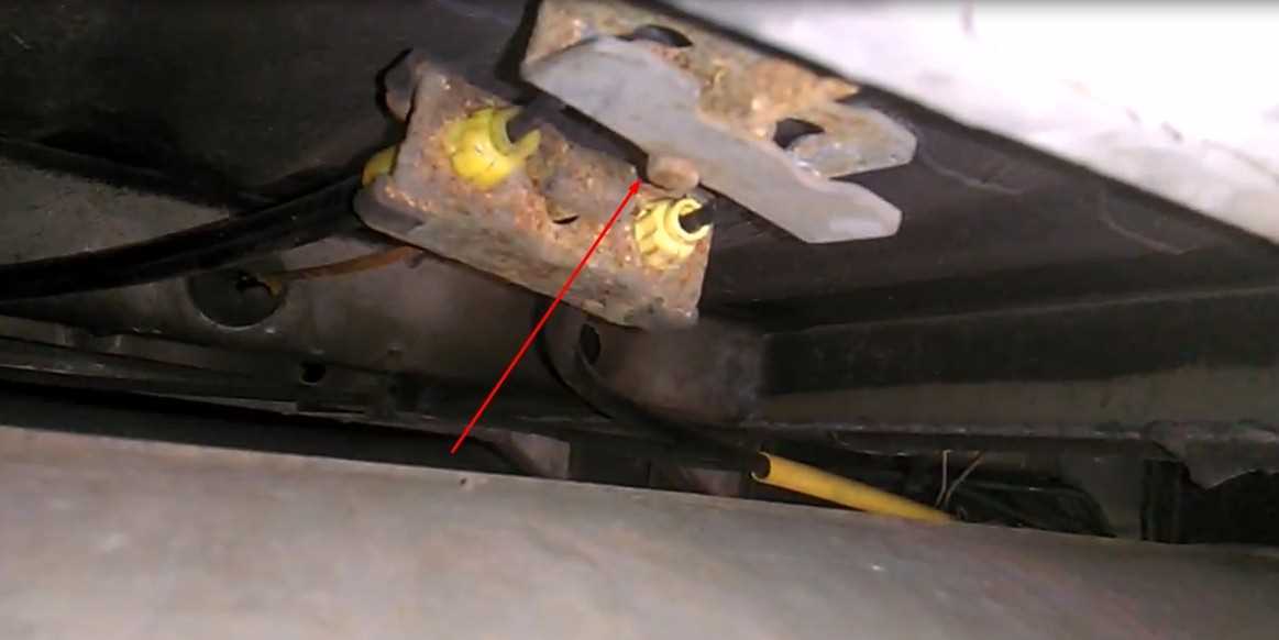 Извлекаем трос из отверстия в основании кузова. Так же другой трос
