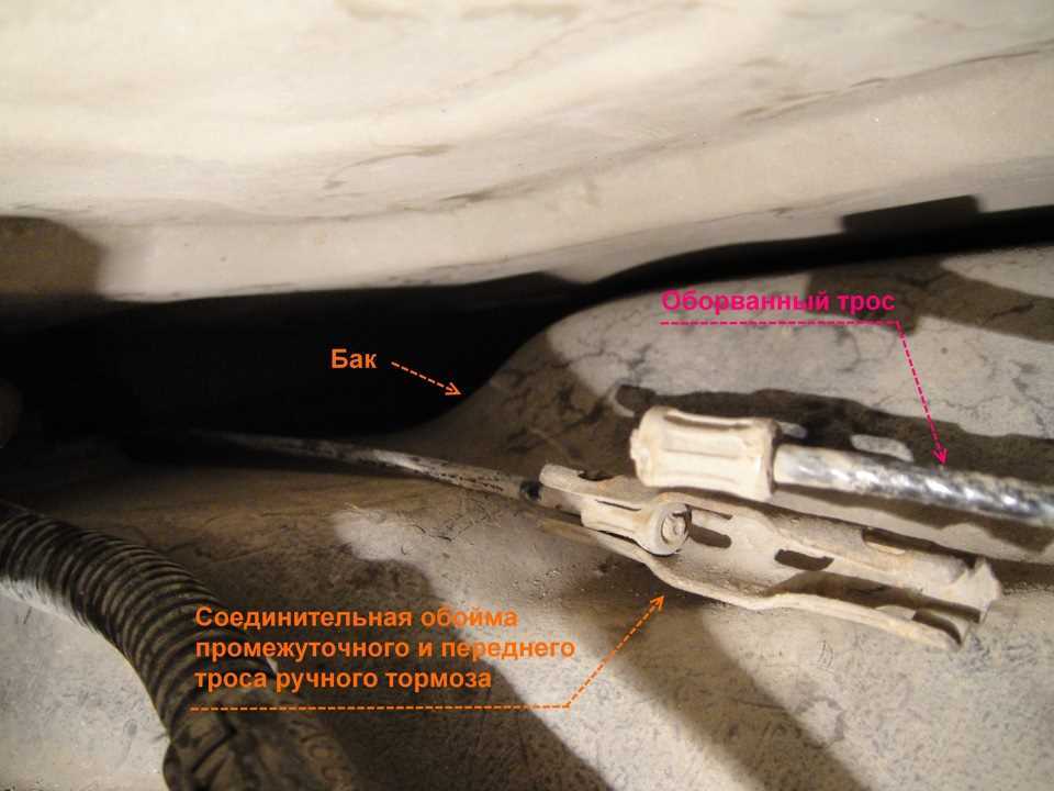 Тросик привода ручника извлекается из технологического проема в основании кузова и с другой стороны.