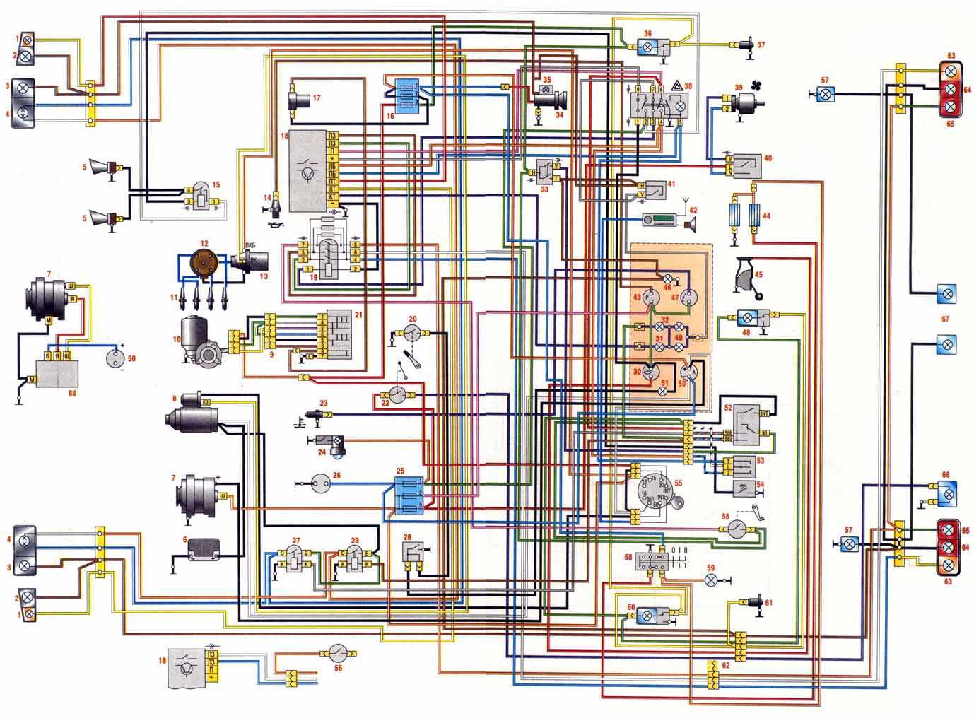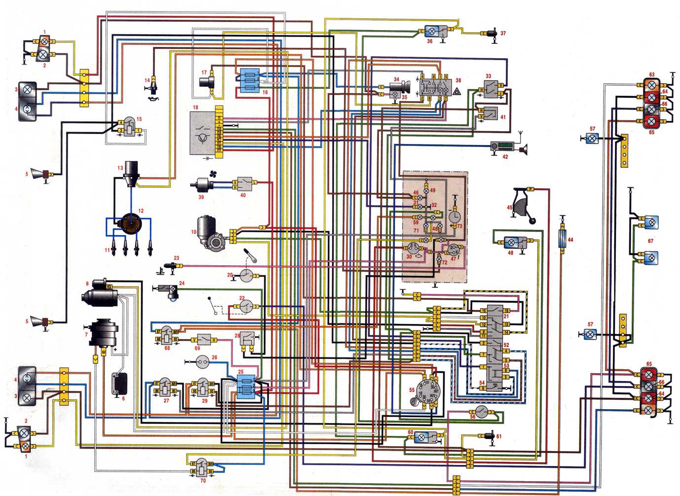 1 — лампа указателя поворота в подфарнике; 2 — лампа габаритного огня в подфарнике; 3 — лампа габаритного огня фары; 4 — лампа ближнего и дальнего света фары; 5 — звуковой сигнал; 6 — электродвигатель насоса смывателя стекла ветрового окна; 7 — электромагнитное реле включения звуковых сигналов; 8 — датчик давления масла; 9 — катушка зажигания; 10 — распределитель зажигания; 11 — свеча зажигания; 12 — стеклоочиститель; 13 — стартер; 14 — аккумуляторная батарея; 15 — генератор; 16 и 17 — электромагнитное реле включения соответственно ближнего и дальнего света фар; 18 — включатель контрольной лампы тормозных систем; 19 и 28 -блоки плавких предохранителей соответственно — левый и правый; 20 — штепсельная розетка переносной лампы; 21 — подкапотная лампа; 22 — датчик указателя температуры охлаждающей жидкости в системе охлаждения двигателя; 23 — включатель фонаря света заднего хода; 24 — включатель контрольной лампы тормозных систем; 25 — переключатель электродвигателей стеклоочистителя и смывателя стекла ветрового окна; 26 — прерыватель тока в цепи ламп указателей поворота; 27 — штекерный соединитель проводов; 29 — включатель габаритного огня; 30 — прикуриватель с лампой; 31, 49 и 57 — плафоны внутреннего освещения салона соответственно правый, задний и левый; 32 — включатель аварийной сигнализации; 33 и 58 — включатель плафона соответственно в правой задней и левой передней двери; 34 — электродвигатель отопителя. кузова; 35 — переключатель электродвигателя отопителя кузова; 36 — включатель ламп освещения шкалы приборов; 37 — радиооборудование; 38 — огревающий элемент стекла; 39 — датчик указателя уровня топлива в баке; 40 — контрольная лампа включения габаритного огня; 41 — указатель давления масла в смазочной системе двигателя; 42 — указатель температуры охлаждающей жидкости, в системе охлаждения двигателя; 43 — контрольная лампа включений дальнего света фар; 44 — лампа освещения шкалы приборов; 45 — контрольная лампа включения указателей поворота; 46 — указатель уровня топлива в баке; 47 — контрольная лампа включения стояночной тормозной системы и нарушения герметичности тормозного гидропривода; 48 — амперметр; 50 — переключатель света фар (на рулевой колонке); 51 — переключатель указателей поворота; 52 — включатель звукового сигнала; 53 — включатель зажигания к стартера; 54 — включатель сигнальных ламп в задних фонарях; 55 — переключатель электрообогревателя стекла заднего окна кузова; 56 — контрольная лампа включения обогрева заднего стекла; 59 — лампа багажного отделения; 60 — лампа поворота в заднем фонаре; 61 — лампа габаритного огня; 62 — лампа сигнала торможения в заднем фонаре; 63 — лампа заднего хода в заднем фонаре; 64 — лампа фонарей освещения номерного знака.
