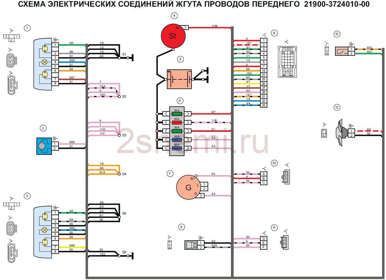 1 – фара правая; 2 – электродвигатель омывателей; 3 – фара левая; 4 – стартер ВАЗ-2190; 5 – батарея аккумуляторная; 6 – блок предохранителей основной; 7 – генератор; 8 – сигнал звуковой; 9, 10, 11 – колодки жгута проводов переднего к колодкам жгута проводов панели приборов; 12 – выключатель лампы света заднего хода; 13 – электровентилятор системы охлаждения двигателя.