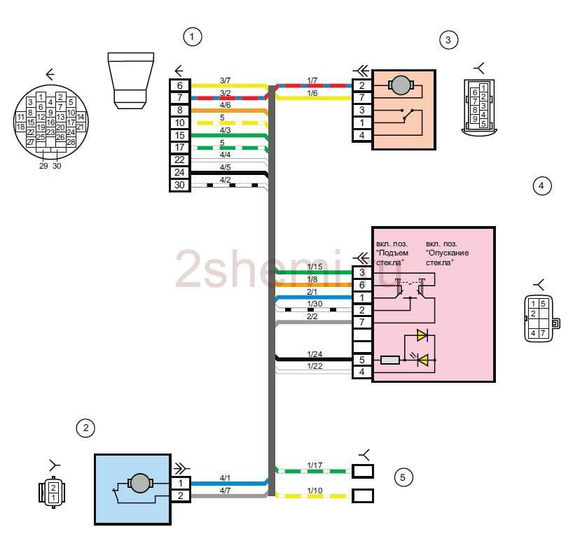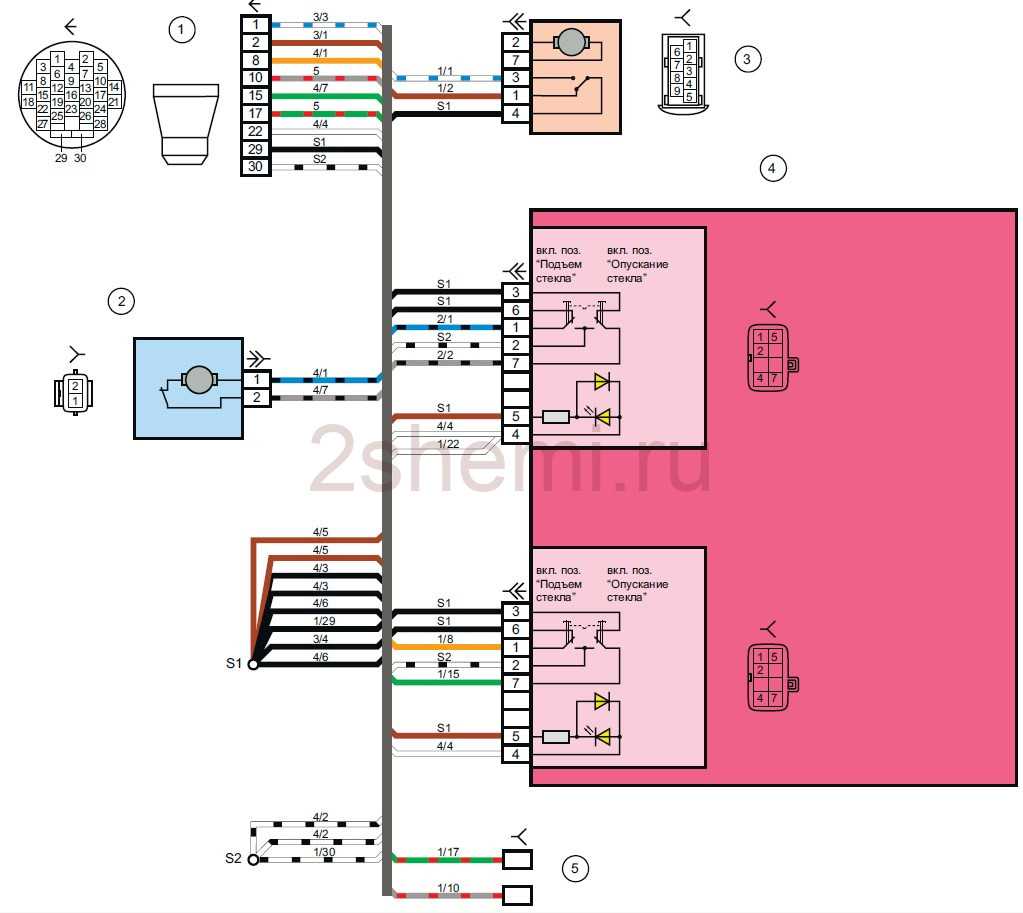 Схема подключения предусматривает прямое соединение стеклоподъемников с кнопками, расположенными на двери водителя и пассажира. Для этого необходимо выполнить следующие шаги: