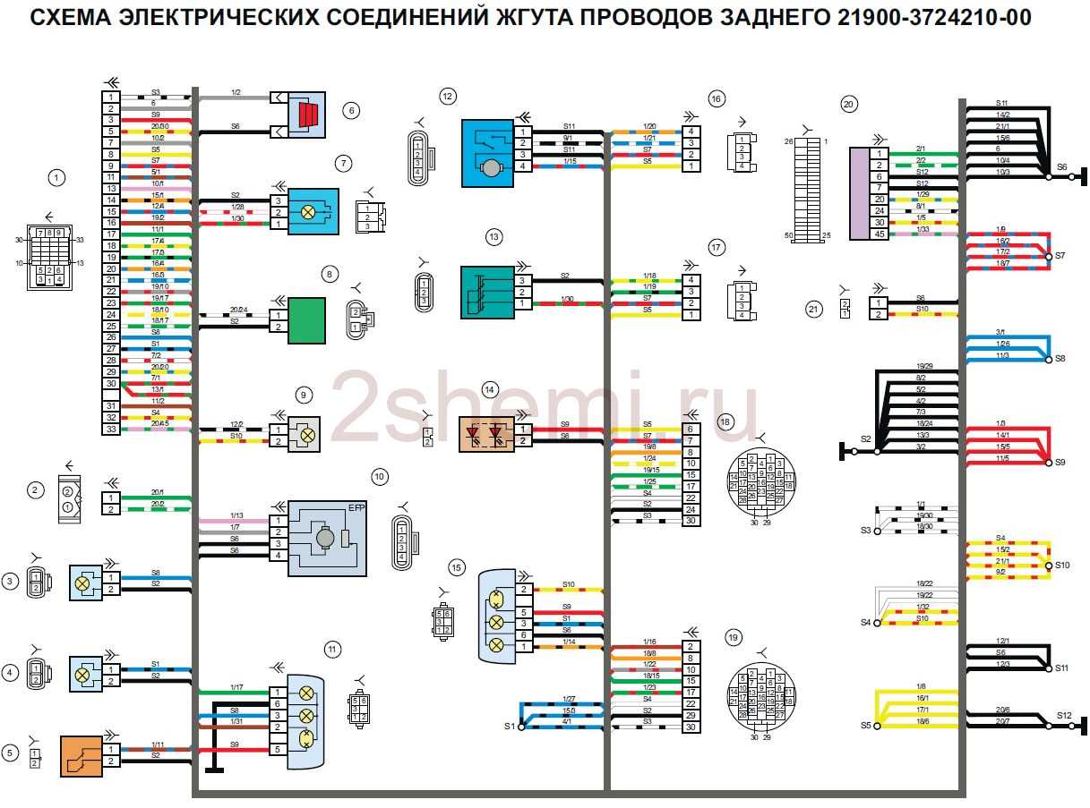 1, 2 – колодки жгута проводов заднего к колодкам жгута проводов панели приборов; 3 – боковой указатель поворотов правый; 4 – боковой указатель поворотов левый; 5 – датчик ручного тормоза; 6 – элемент обогрева заднего стекла; 7 – плафон освещения салона; 8 – выключатель в ремне безопасности водителя; 9 – фонарь освещения багажника; 10 – модуль электробензонасоса; 11 – фонарь правый; 12 – электродвигатель блокировки багажника; 13 – выключатель плафона освещения салона; 14 – дополнительный сигнал торможения; 15 – фонарь левый; 16 – колодка жгута проводов заднего к колодке жгута проводов задней левой двери; 17 – колодка жгута проводов заднего к колодке жгута проводов задней правой двери; 18 – колодка жгута проводов заднего к колодке жгута проводов передней правой двери; 19 – колодка жгута проводов заднего к колодке жгута проводов передней левой двери; 20 – блок управления надувных подушек безопасности; 21 – колодка жгута проводов заднего к колодке жгута проводов фонарей освещения номерного знака.