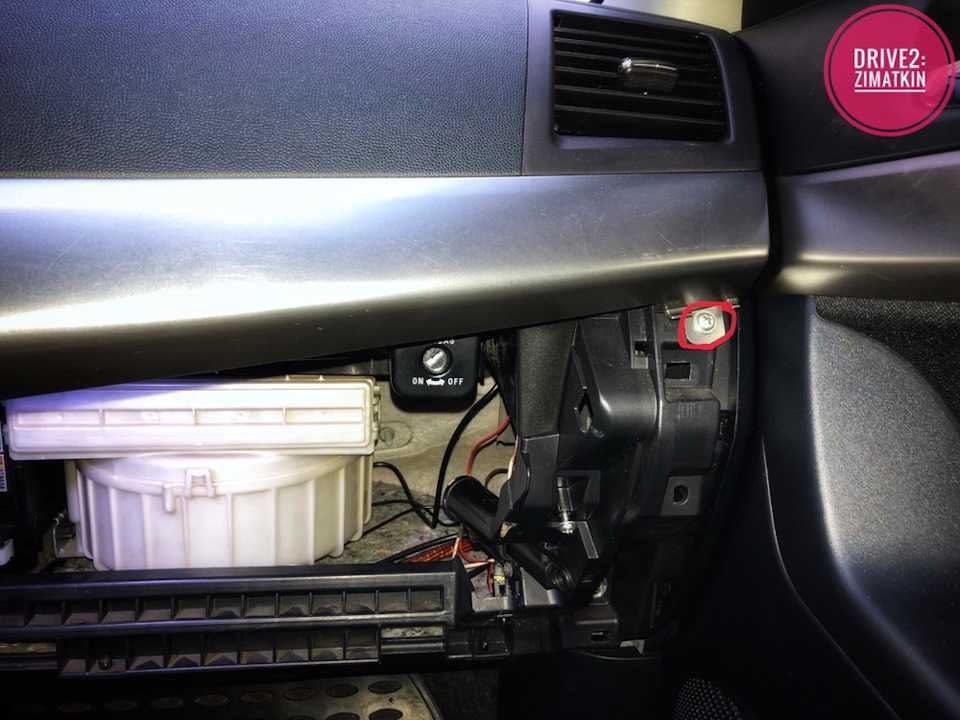 9. Откручиваем саморезы, крепящие замок отключения пассажирской подушки (если есть) и 4 самореза, крепящие верхнюю панель в бардачке.