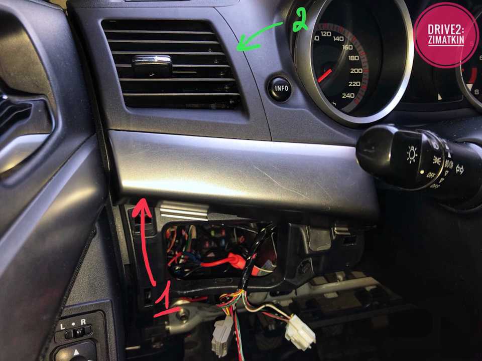 Приступим к установке!Снимаем бардачок. Фото не прикладываю, всё предельно просто. Открываем бардачок, с боков надавливаем, чтобы вышли фиксирующие пазы, снимаем защёлку газового упора, наклоняем бардачок ещё ниже и снимаем его.