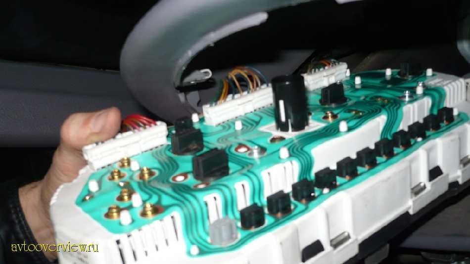 Снять приборную доску со своего места не составит большого труда, для этого опускаем рулевую колонку и выкручиваем два самореза, которые находятся сверху. Нижняя часть сидит на пистонах, поэтому стоит применить только небольшое усилие и панель выйдет из своего места. После этого остается только отсоединить два разъема и все остальные работы можно проводить дома, удобно устроившись за столом.