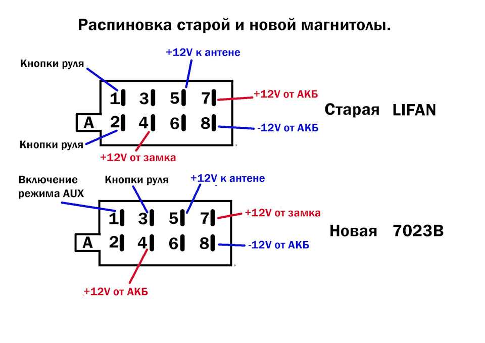 Далее я обнаружил, что в новой и старой магнитоле отличается подключение контактов 4 и 7. Их пришлось менять местами. Иначе в магнитоле при выключении и включении зажигания сбрасывались настройки радиостанций, время и дата, а также флешка начинала играть с первого трека.