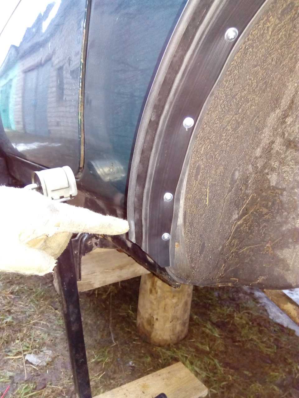 Расширители нужно сразу нарезать с большим запасом, и под арки подгонять уже когда прикрутишь. Тут главное не полениться и отрезать ровно и плавно. Тогда будет красиво. Еще я выдавливал силиконового герметика в угол расширителя чтобы там влага не скапливалась и не гнил кузов. С этими расширителями ездил по лютым буреломам, деревьями расширители заламывало почти заподлицо с кузовом, но ничего не вырвало, как новые.