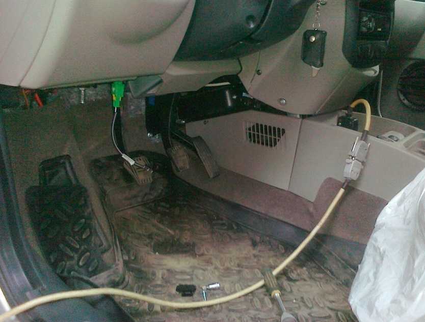 Поднимаем руль в максимальное положение и также отодвигаем сидение. Около педали сцепления мы видим такую картину: