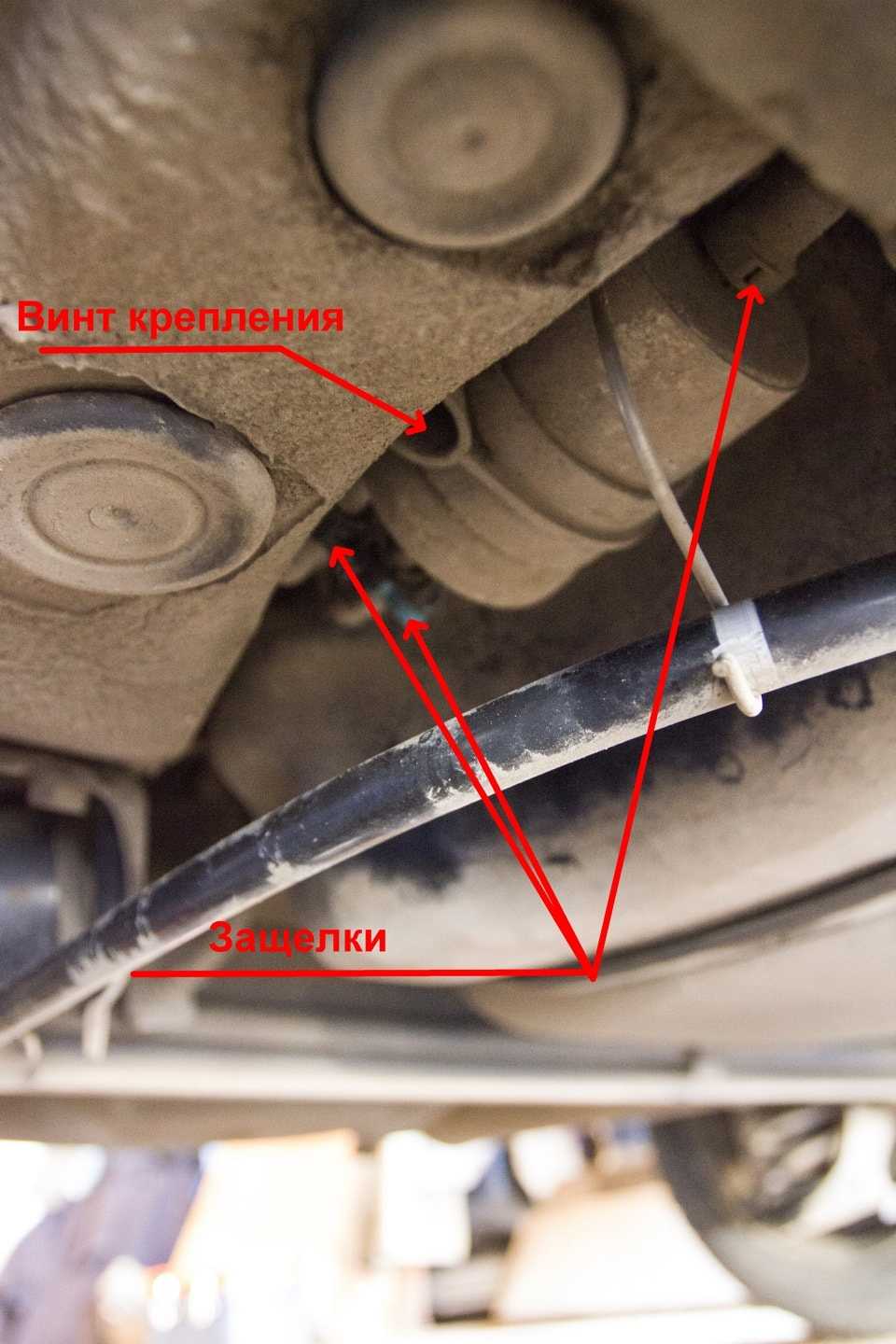 - Облегчить доступ к объекту поможет отсоединение троса ручного тормоза от фиксатора как показано на рисунке.