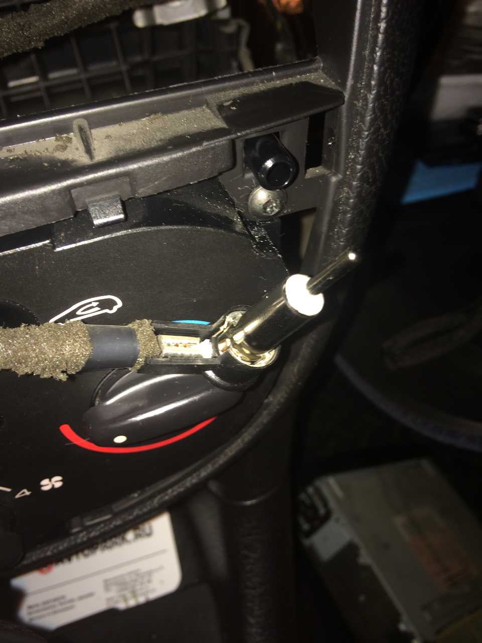 1. Снять козырек над часами сверху (он на защелках, тянем на себя и он снимется).2. Открутить два болтика и снять переднюю панель (картинки есть в предыдущем посте про замену лампочек).3. Отсоединить провода от магнитолы. На антенный штекер сразу одел переходник.