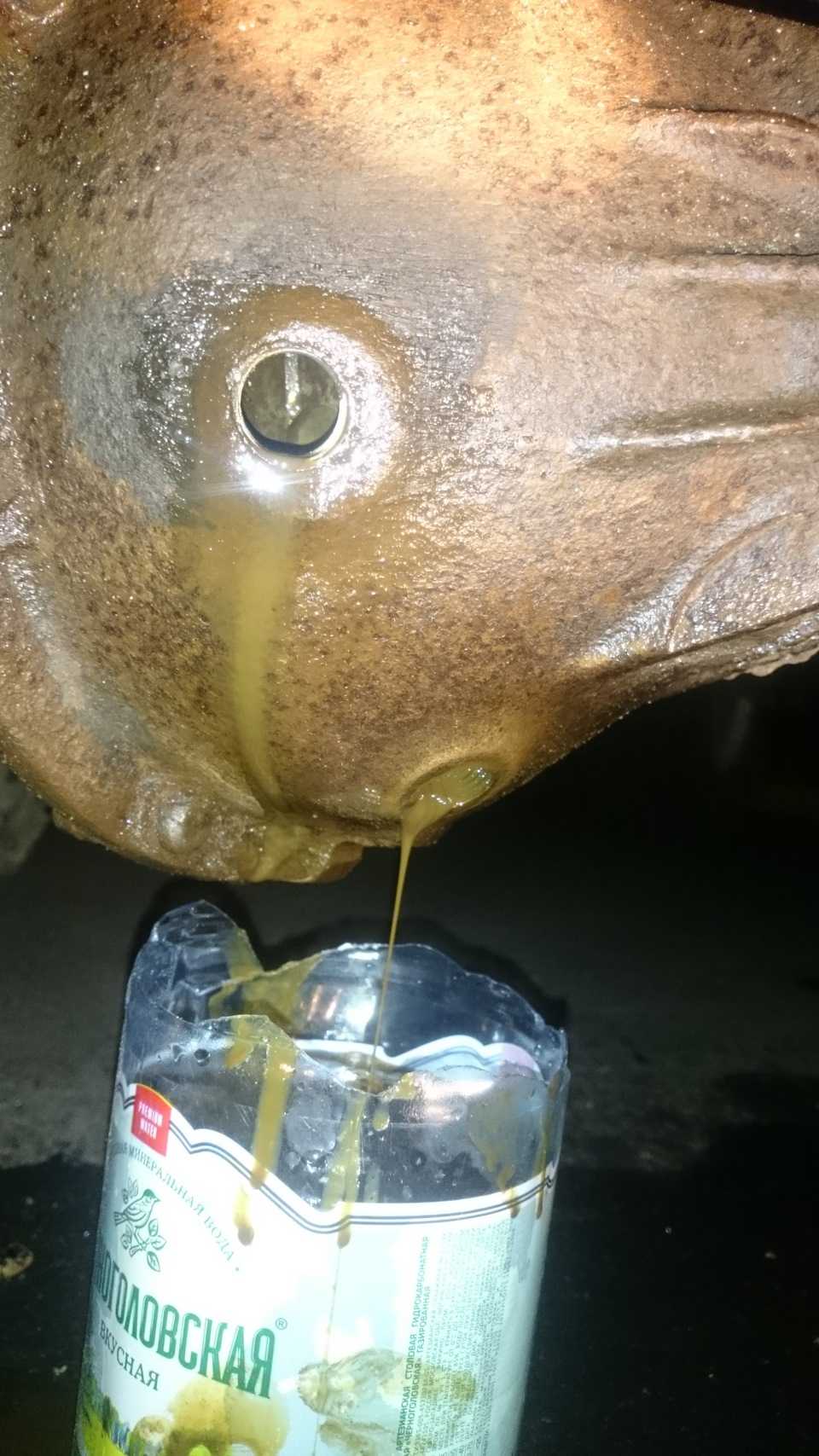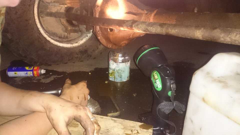 Дело было… как обычно ночью, дела были, но Ксения требует внимания.В планах было вчера только посетить автозапчасти, купить патрубки для СО (Система Охлаждения) и поспать. Но получилось так, что в отделе ГАЗ УАЗ народу было тьма и стоять в очереди не хотелось… Ну что ж теперь, не зря ж приехал, купил масла в мосты 4 литра (с запасом на промывку), шприц и баклаху в 10 литров для слива тосола.Процесс замены масла не сложный… Но на всякий случай для те хто не в курсе.С морды залезаем под машину (хорошо что лифтована машина, очень удобно для починок в поле), находим 2 пробки, откручиваем верхнюю (она же заливная), если масло потекло из нее, значит оно есть и это уже не плохо. У меня после откручивания заливной пробки полилось масло достаточно толстой струйкой, и я даже перепугался, что есть пробка выше для залива… но нет, все как положено.Если масло не льется, то засовываем палец и пытаемся его нащупать. Если нащупали, то хорошо ) Оно еще есть, но насколько глубже вы засовываете палец, настолько хуже положение.Собственно узнали уровень масла, теперь сливаем все, открутив вторую пробку.У меня цвет масла был как кофе с молоком, не знаю о чем это говорит, но точно не о хорошем… В отверстиях были видны шестерни и они блестели, с легким налетом ржЫ.