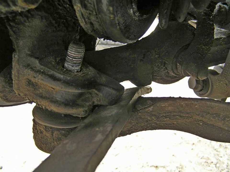 - Находим гайку на нижнем заднем рычаге и, очистив и полив жидкостью ВД−40, откручиваем ее. Далее нужно вставить монтировку. Тянем аккуратно вверх, чтобы нижний рычаг отошел от поворотного кулака.