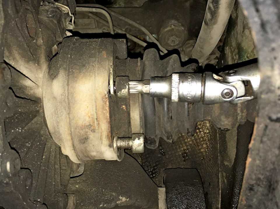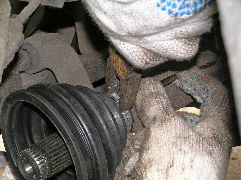 Включаем любую передачу, извлекаем шарнир (передача включается с целью фиксации полуоси), закручиваем до конца в его центр болт.