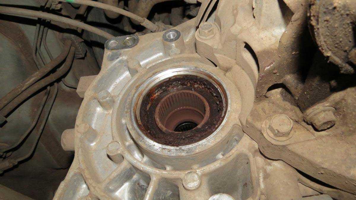 Причина неисправности — сальник, который находится у входа в промежуточный вал правого полуоси в раздаточной коробке (вот его ОЕ номер: 47352-39300). Также причина в том, что сам шлиц работает без какой-либо заводской смазки.