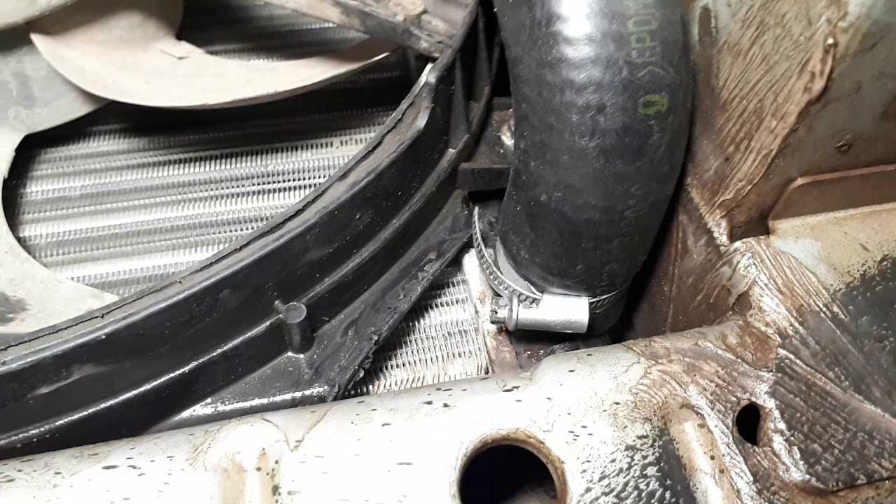 11. Отсоедините болты крепления корпуса электровентиляторов и оттяните на себя радиатор для доступа к нижнему патрубку. Ослабьте его хомут и снимите шланг.
