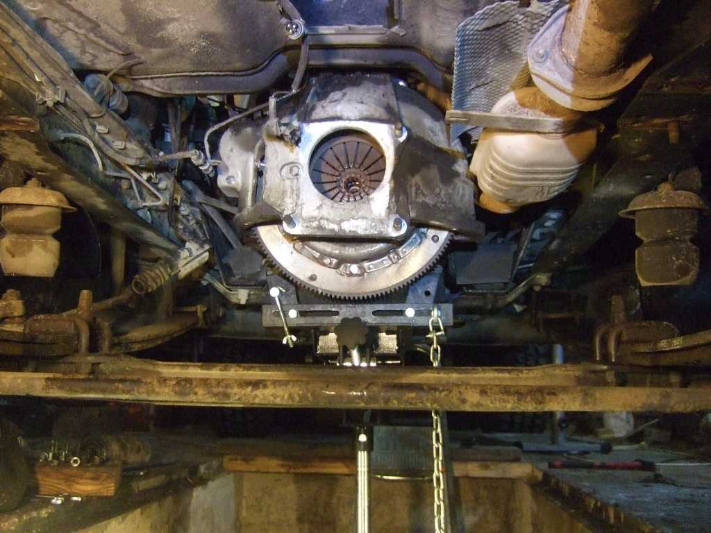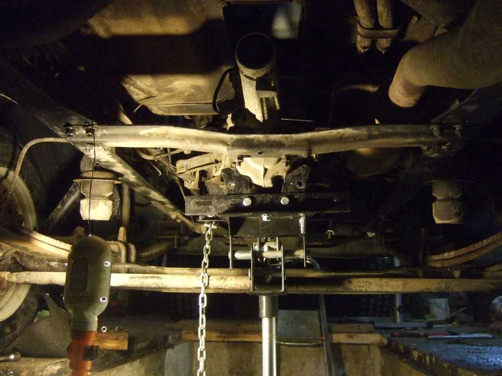 Дальше, с помощью трансмиссионной стойки подпираем КПП и откручиваем болты крепления траверсы.