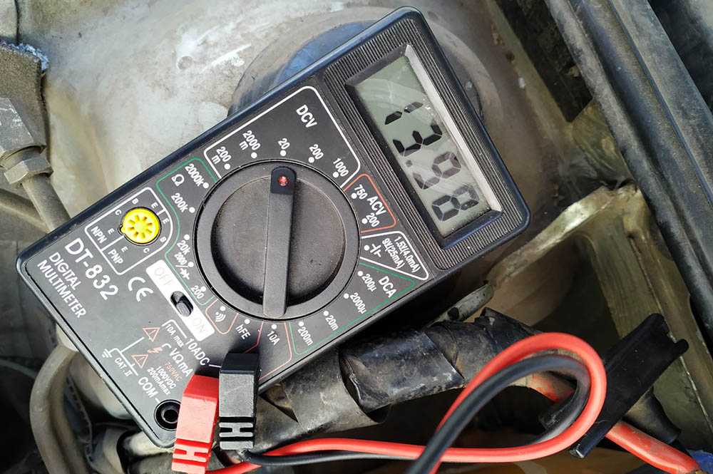 Прежде чем разобрать такой сложный электрогенерирующий узел, следует убедиться, что причина неисправности кроется в нём самом. Поэтому сначала нужно проверить напряжение и зарядку. Берём вольтметр и подсоединяем его на участке между красным проводом и «массой» аккумуляторной батареи.