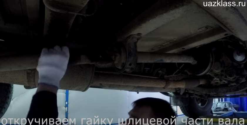 - Приступаем к отвинчиванию заднего карданного вала в месте его соединения с раздаточной коробкой.