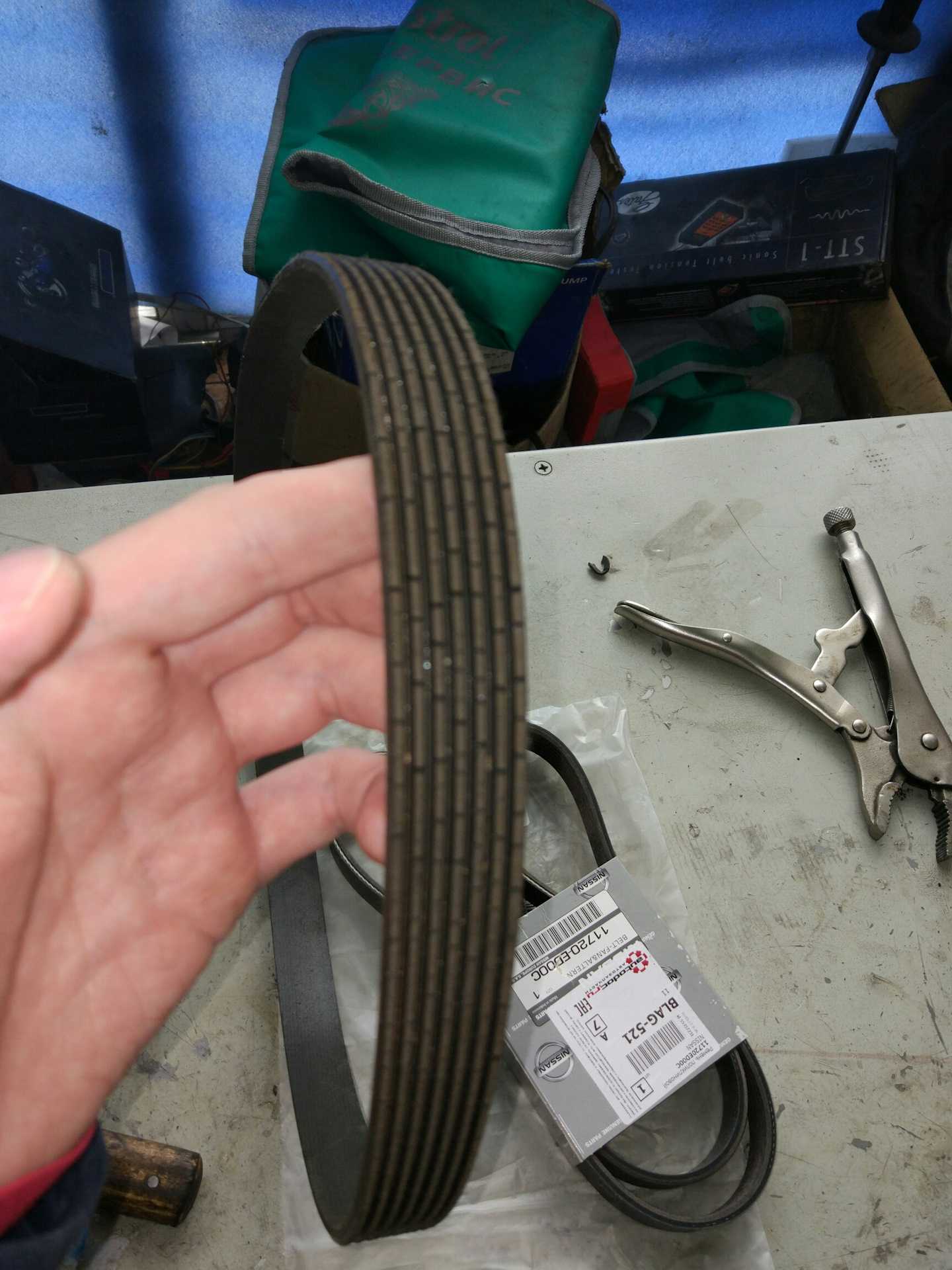 При низкой температуре и влажности появляются посторонние звуки. Чтобы затянуть ремень генератора на носу Nissan, необходимо: поднять автомобиль на домкрате, снять колесо, выкрутить и снять вкладыш (его держат на 3 винтах внизу и на 3 хомута). Ролики ремень новый, не оригинальный подозрительность