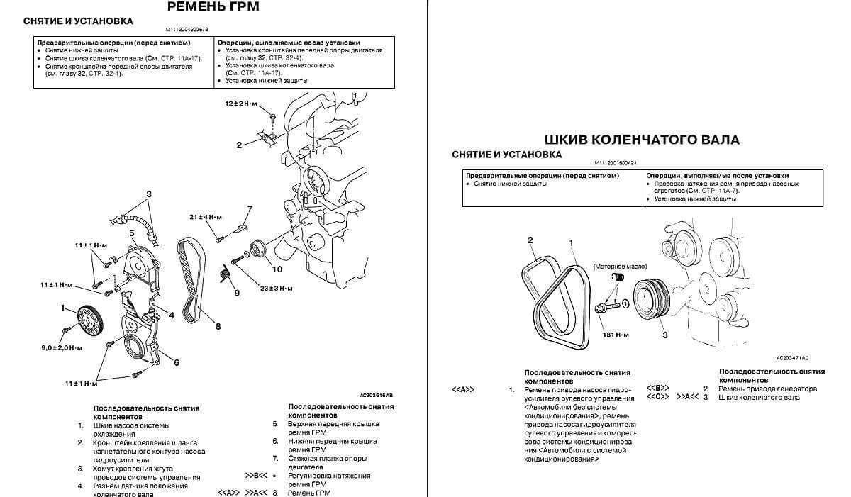 Внимание: если установочные метки не совмещены, то клапаны могут «встретиться» с поршнем при повороте шкива распределительного вала, когда поршень находится в ВМТ.Внимание: при повороте шкива распределительного вала на один полный оборот (для совмещения меток), когда шкив другого распределительного вала остается неподвижной (метки совмещены), может произойти соударение впускных и выпускных клапанов вследствие нарушения фаз газораспределения.Внимание: при затяжке стопорного болта убедитесь в том, что вал ролика натяжителя не поворачивается вместе с болтом.Замечание: перед снятием убедитесь, что проволока может быть легко извлечена из отверстия корпуса натяжителя.Примечание: обезжиривание необходимо для улучшения сопряжения деталей.Внимание: надежно закрепите специальный инструмент, чтобы он не проворачивался