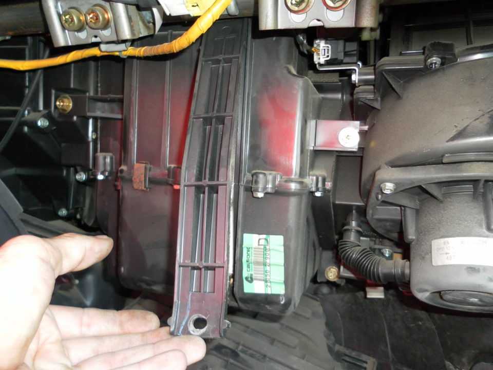 5) Вместе с бардачком снимаем держащую его кусок панели незабыв отщелкнуть его с верхнего краяВытащив лампочку подсветки из гнезда убираем в сторону.Взору предстает короб испарителя, фильтра, вентилятор (радиатор печки не заметил ибо не искал).6) Ну дальше вообще делать нефиг, стягиваешь вниз клипсу (хотя подозреваю что она тут не родная и там когда то стоял шуруп))))) и снимаешь вниз узкую прямоугольную крышку.