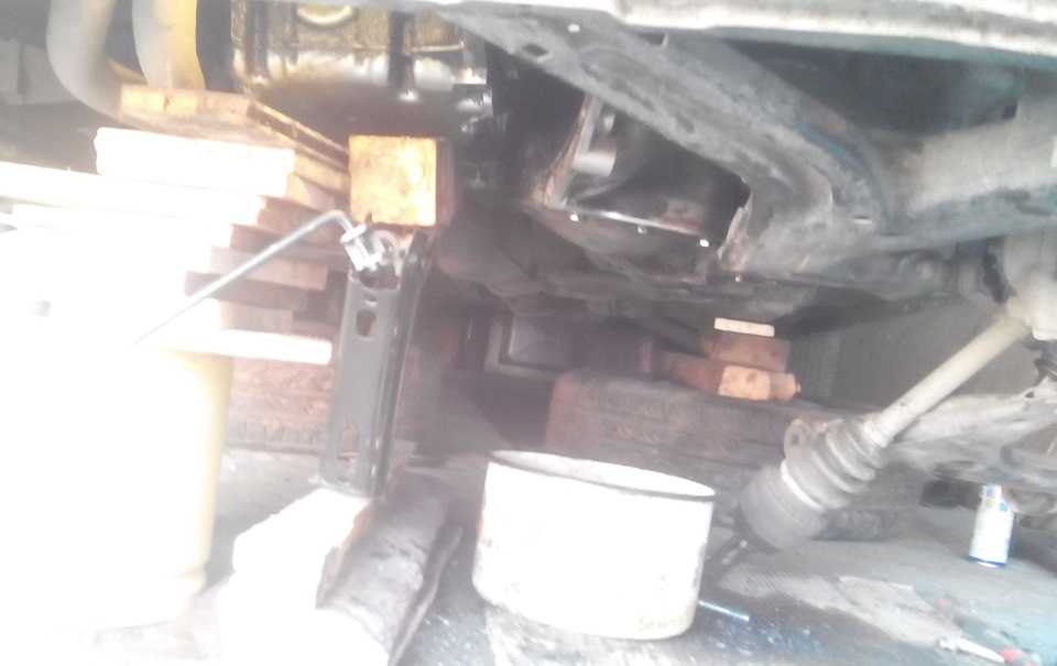 Не удивляйтесь, сразу до блока коробка не зайдет, произойдет это только после затяжки всех болтов. Я делал следующим образом, так как в «Букваре», написано, что прокачка проводится на стенде, которого у меня нет, сделали так нужен второй человек. Поддомкрачиваем двигатель что прослужит дополнительной опорой, при демонтаже подушек КПП Делаем дополнительную опору для КПП я положил брусок на подрамник и откручиваем саму коробку от двигателя.