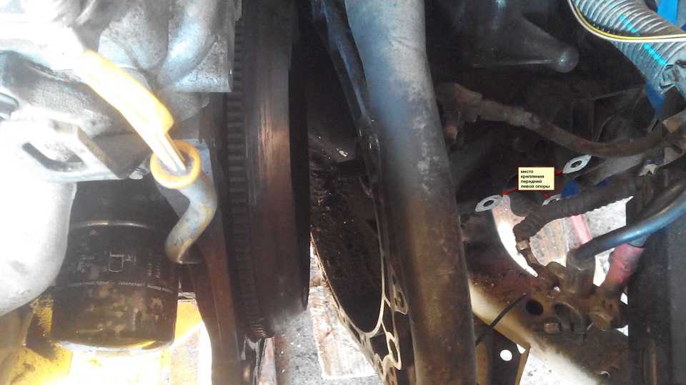 Схема Так все болты к мотору я открутил зову помошника чтоб ловил коробас, отчепляю верхнюю подушку коробки и всё коробу всторону, до конца я её не вынимал — пространства стоновиться достаточно чтобы всё заменить!