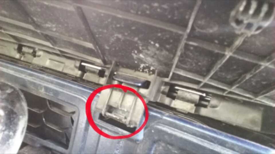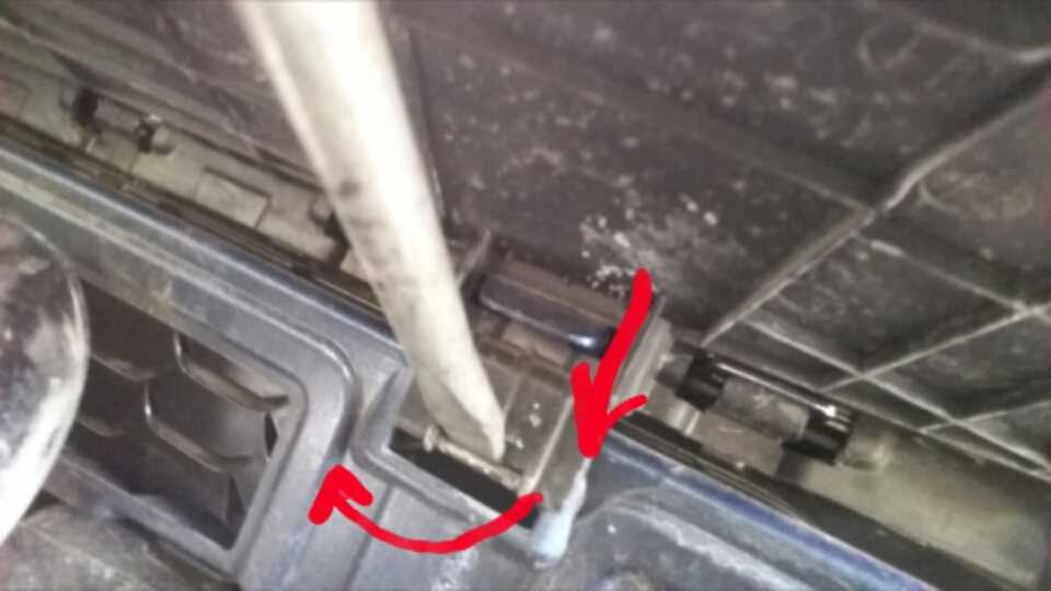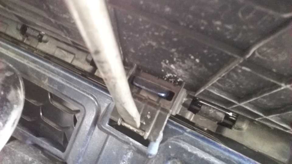 После успешного откручивания крепежа осторожно потяните радиатор, затянув два зажима крепления. Иногда защелки не поддаются, в этом случае необходимо согнуть их длинным предметом, пропустив его между бампером и решетчатой защитой.