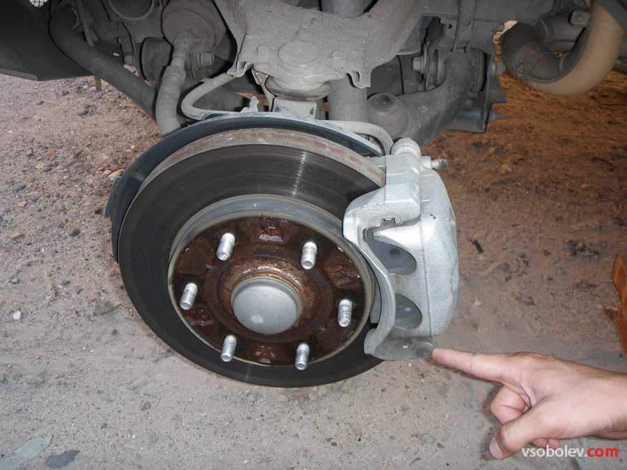 Далее откручиваем два болта что держат тормозные скобы. Снимаем колодки и отводим супорт в сторону.