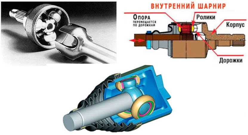 Если внешний – это практически всегда шестишариковая «граната» внушительных размеров, то в качестве внутренних часто используется трёхшиповой шарнир типа «трипоид» с игольчатыми подшипниками.